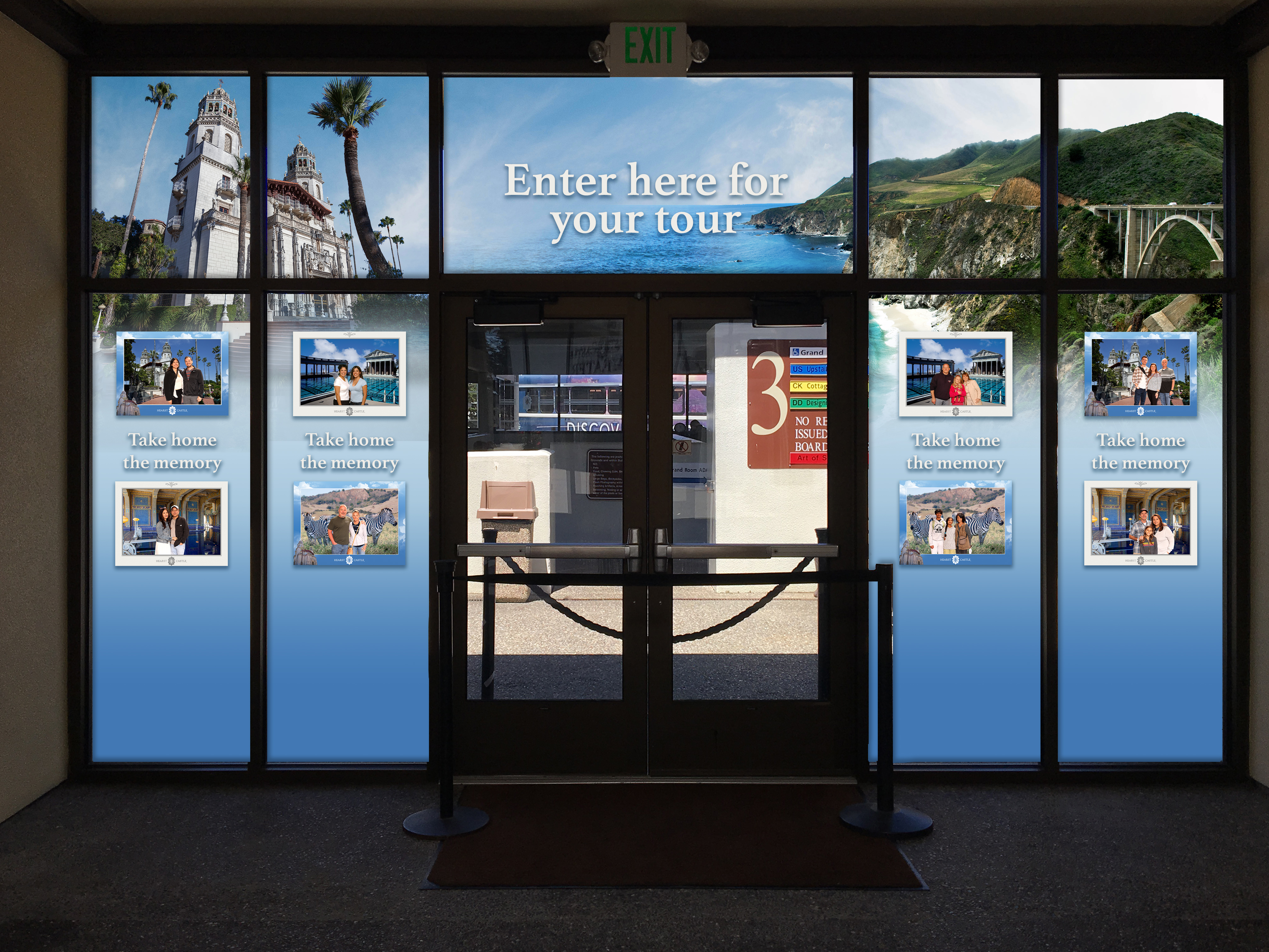 Recent projects include updating the photo booth counter wrap for a souvenir photo location at Hearst Castle, with a mock-up presented to the client for approval.